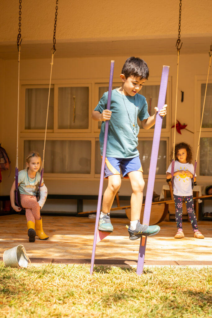 Quando a criança experimenta o equilíbrio nas pernas de pau ou o compasso da corda, ela